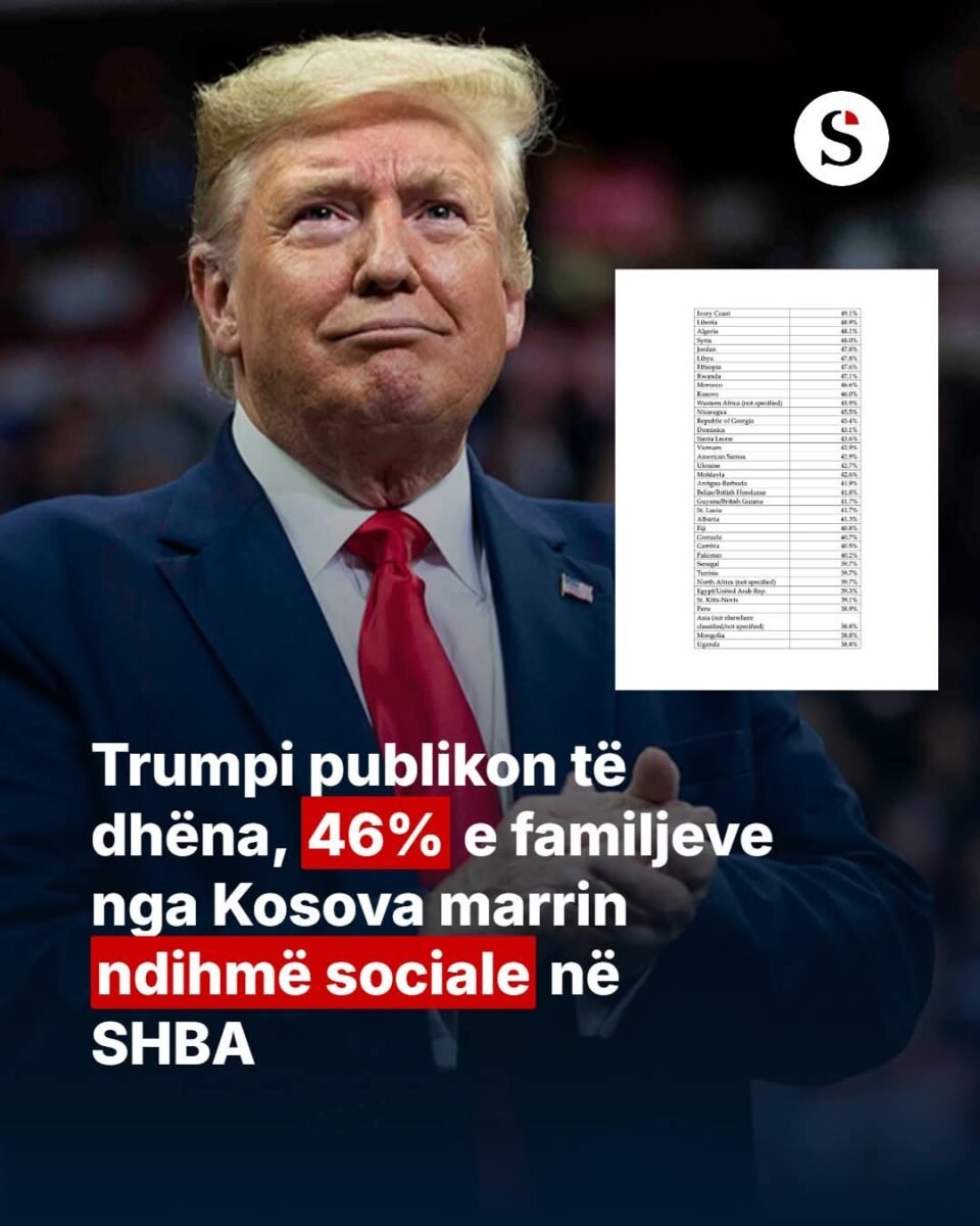 Në listë gjenden edhe Kosova e Shqipëria. Sipas listës së Trumpit, 46 për qind të familjeve nga Kosova që jetojnë në SHBA marrin ndihmë sociale e 41.3 për qind të familjeve nga Shqipëria.
