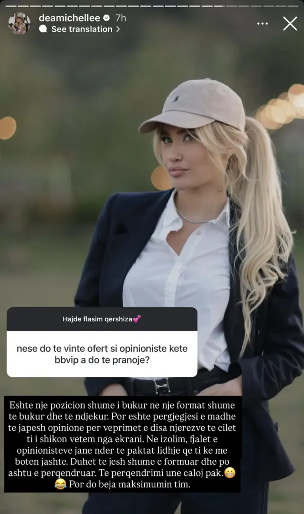 Influencerja dhe ish-banorja e “Big Brother VIP Albania”, Dea Michelle ka reaguar së fundmi ndaj pyetjes nëse do të pranonte një ofertë për të qenë opinioniste në sezonin e ri të “Big Brother VIP Albania”. Përmes një serie pyetje-përgjigje në Instagram, ish-banorja e “BBVA”-së u shpreh se pozicioni është i bukur dhe i rëndësishëm, por njëkohësisht kërkon shumë përgjegjësi.