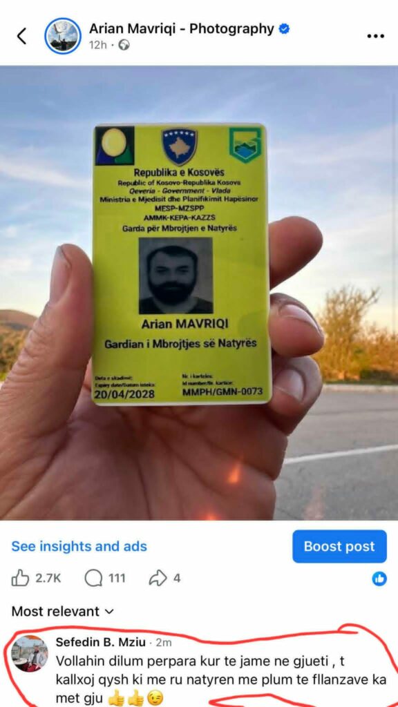 Gjuetari Sefedin Mziu e ka kërcënuar me jetë fotografin Mavriqi, duke thënë se nëse i del përpara në natyrë, do e gjuaj me plumb të thëllënzave./Indeksonline/