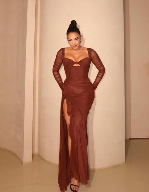 E veshur me një fustan unik në nuanca kafe, Jonida u shfaq tejet glamuroze. Prerja e guximshme me çare anësore theksoi linjat trupore, ndërsa detajet transparente i shtuan finesë dhe sensualitet look-ut.