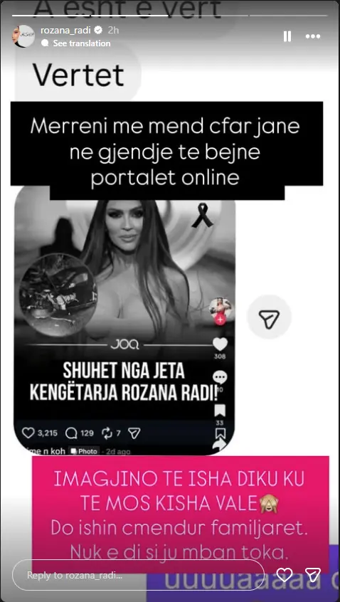 “Shuhet nga jeta këngëtarja Rozana Radi”, shkruhet në titullin e këtij lajmi të rremë, duke e bërë situatën edhe më shqetësuese për ata që e njohin dhe e duan këngëtaren.