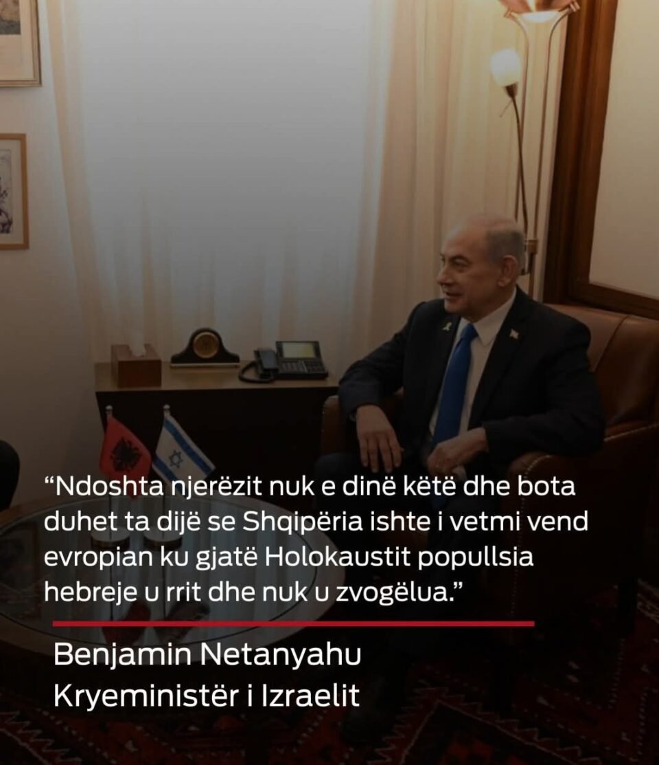 “U rrit sepse shqiptarët, shqiptarët myslimanë, në frymën e moderimit, të tolerancës dhe të dinjitetit njerëzor, mbrojtën qindra hebrenj që jetonin në Shqipëri në atë kohë dhe gjithashtu pritën shumë të tjerë. Kjo është fryma që ju përfaqësoni. Kjo është historia – po flisnim për të disa minuta më parë – kjo është historia që bota duhet ta dijë. Kjo është lënda, siç thatë ju, e filmave frymëzues”- tha Netanyahu.