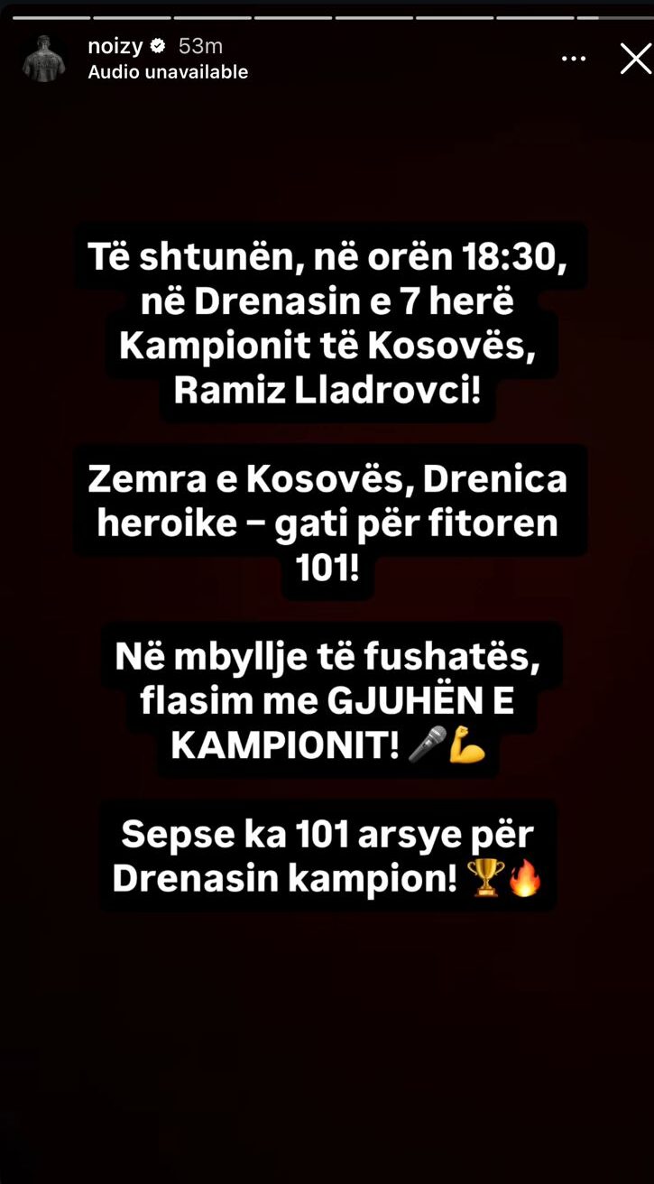Në shkrimin e bërë nga Noizy, ai e quan Lladrovcin “7 herë kampion i Kosovës” dhe thekson se do të jetë në Drenas për të folur “me gjuhën e kampionit”.