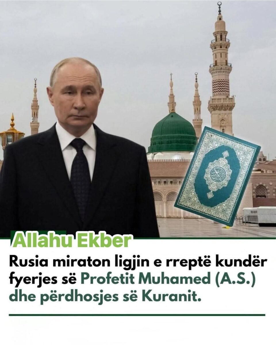 Presidenti Vladimir Putin ka nënshkruar një ligj që parashikon dënime të ashpra për ata që fyejnë Profetin Muhamed (A.S.) ose përdhosin Kuranin e Shenjtë. Ky hap forcon qëndrimin e Rusisë në mbrojtje të harmonisë fetare dhe të ndjenjave të komunitetit mysliman. Shkelësit do të përballen me pasoja të rënda ligjore sipas legjislacionit të ri.
