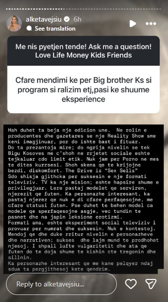Moderatorja dhe producentja, Alketa Vejsiu, ka ndarë një reagim të gjatë në Instagram, ku shpreh mendimin e saj për “Big Brother Kosova”, si format dhe si realizim.