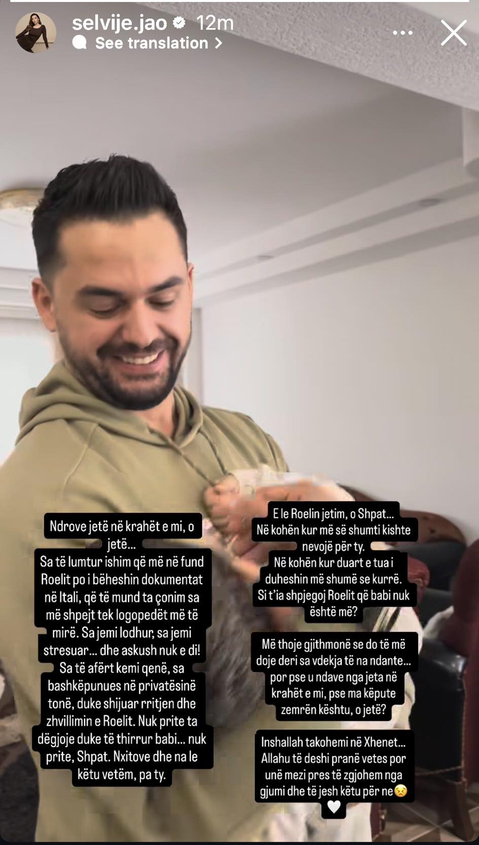 Sa të afërt kemi qenë, sa bashkëpunues ё privatësinë tonë, duke shijuar rritjen dhe zhvillimin e Roelit. Nuk prite ta dëgjoje duke të thirrur babi… nuk prite, Shpat. Nxitove dhe na le kétu vetëm, pa ty.”