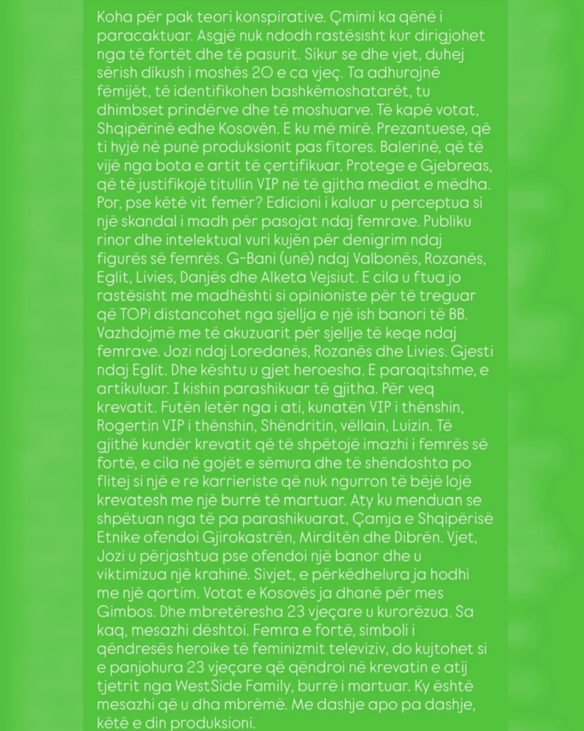 Në një reagim të gjatë dhe mjaft kritik, G Bani ka hedhur dyshime mbi mënyrën e zhvillimit të spektaklit, duke lënë të kuptohet se çmimi mund të ketë qenë i paracaktuar dhe se, sipas tij, “asgjë nuk ndodh rastësisht kur dirigjohet nga të fortët dhe të pasurit”.