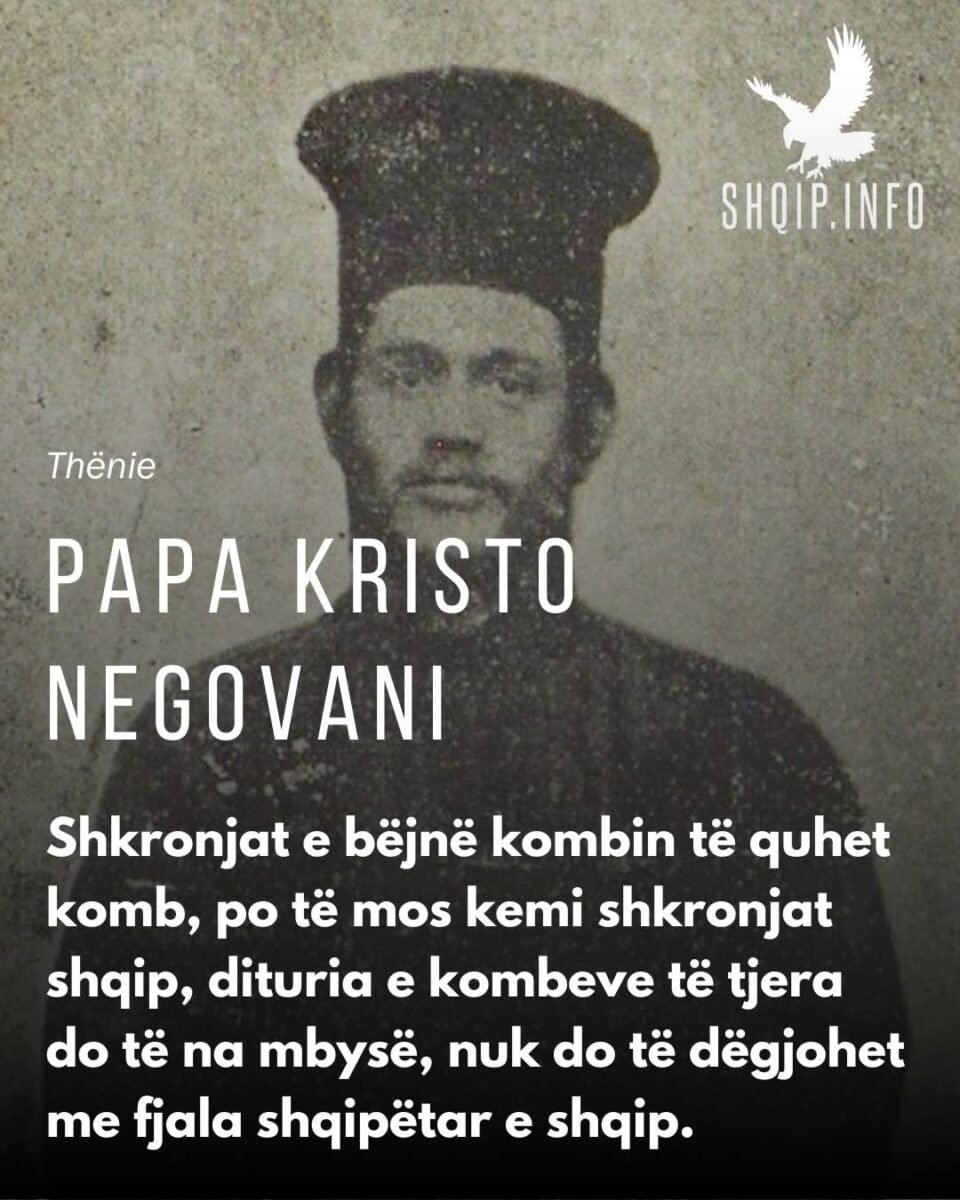 HistoriKulturëShkronjat e bëjnë kombin të quhet komb by dardanianewsSeptember 7, 2025086 Share0 Shkronjat e bëjnë kombin të quhet komb, po të mos kemi shkronjat shqip, dituria e kombeve të tjera do të na mbysë, nuk do të dëgjohet me fjala shqipëtar e shqip. Papa Kristo Negovani.