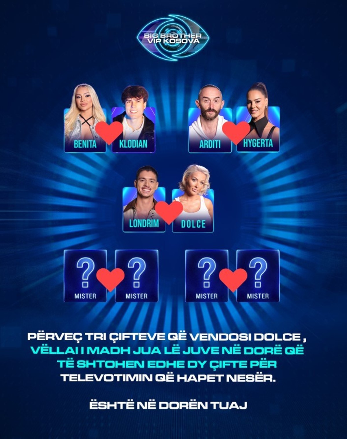 Megjithatë, moderatori ka zgjedhur të mos zbulojë asnjë detaj shtesë, duke lënë të hapur misterin rreth çiftit dhe mënyrës se si do të organizohet ceremonia, duke e ruajtur surprizën për episodet në vazhdim. /Telegrafi/